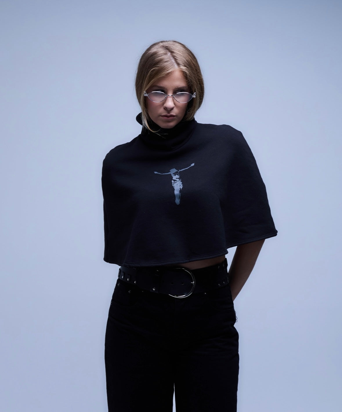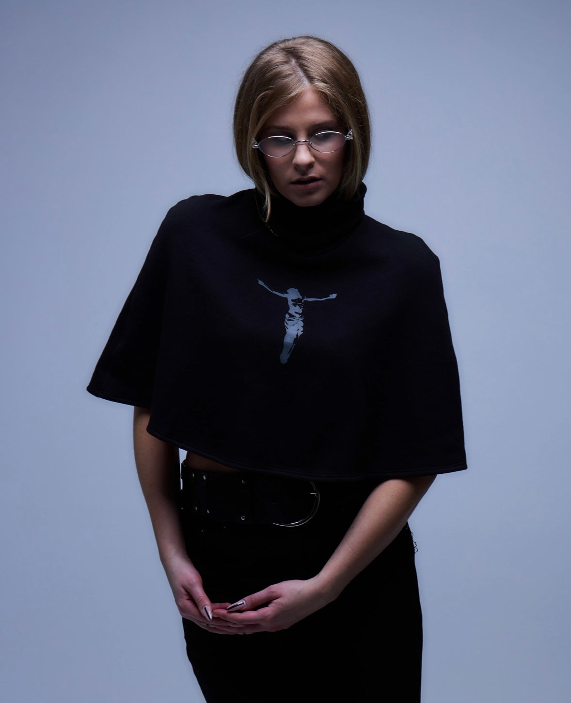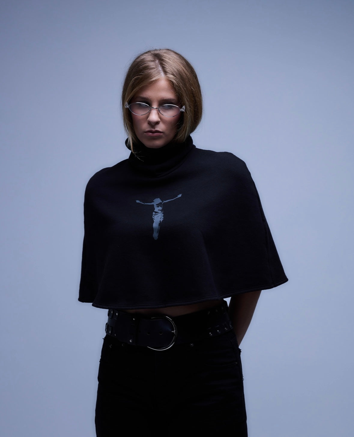 The 013 Crucifixion Shawl featuring a grey crucifixion graphic across the front. Designed with a timeless fit and finished with a high turtleneck, the piece balances structure and symbolism for a strong yet understated presence. A unique one of one piece.