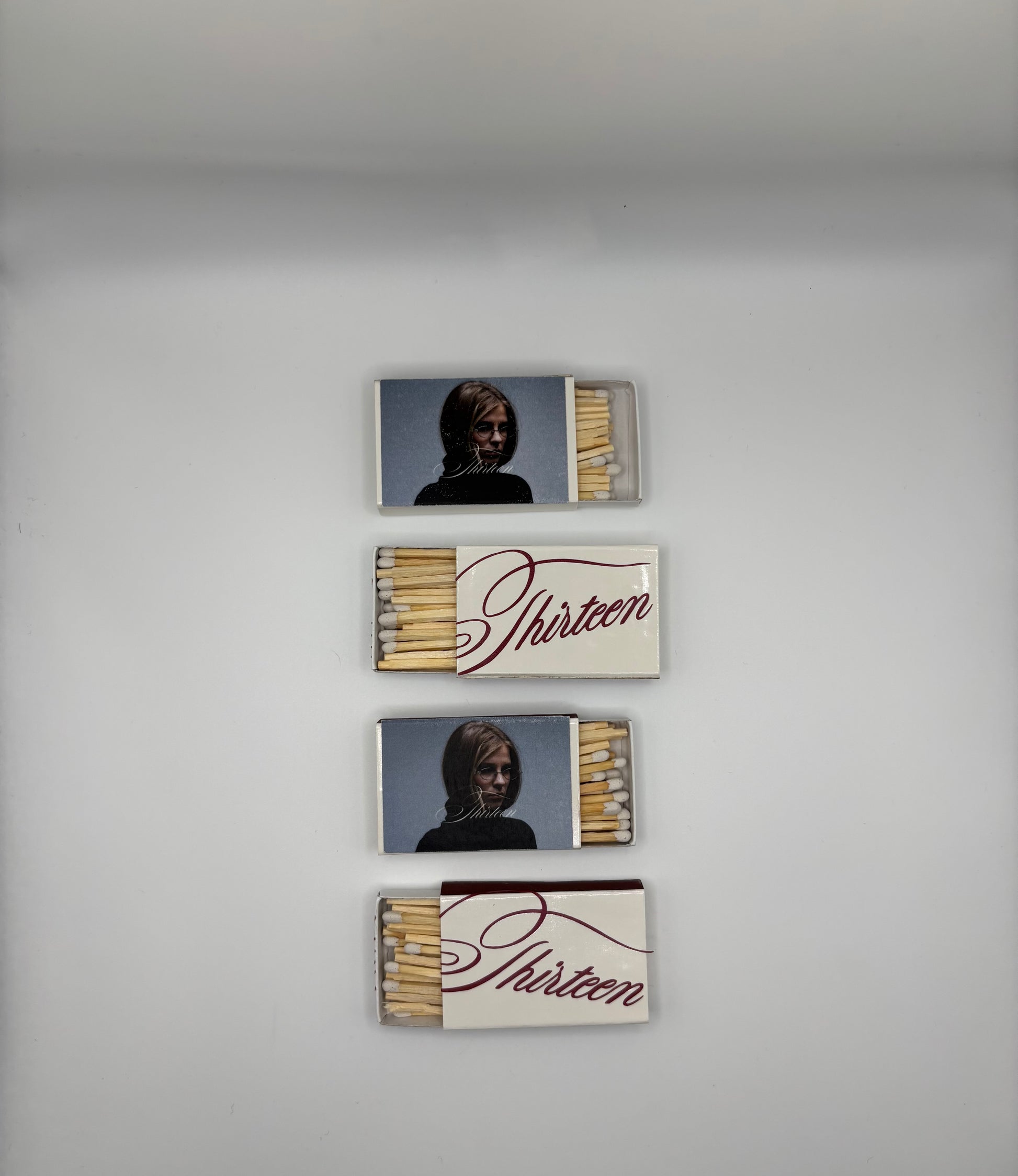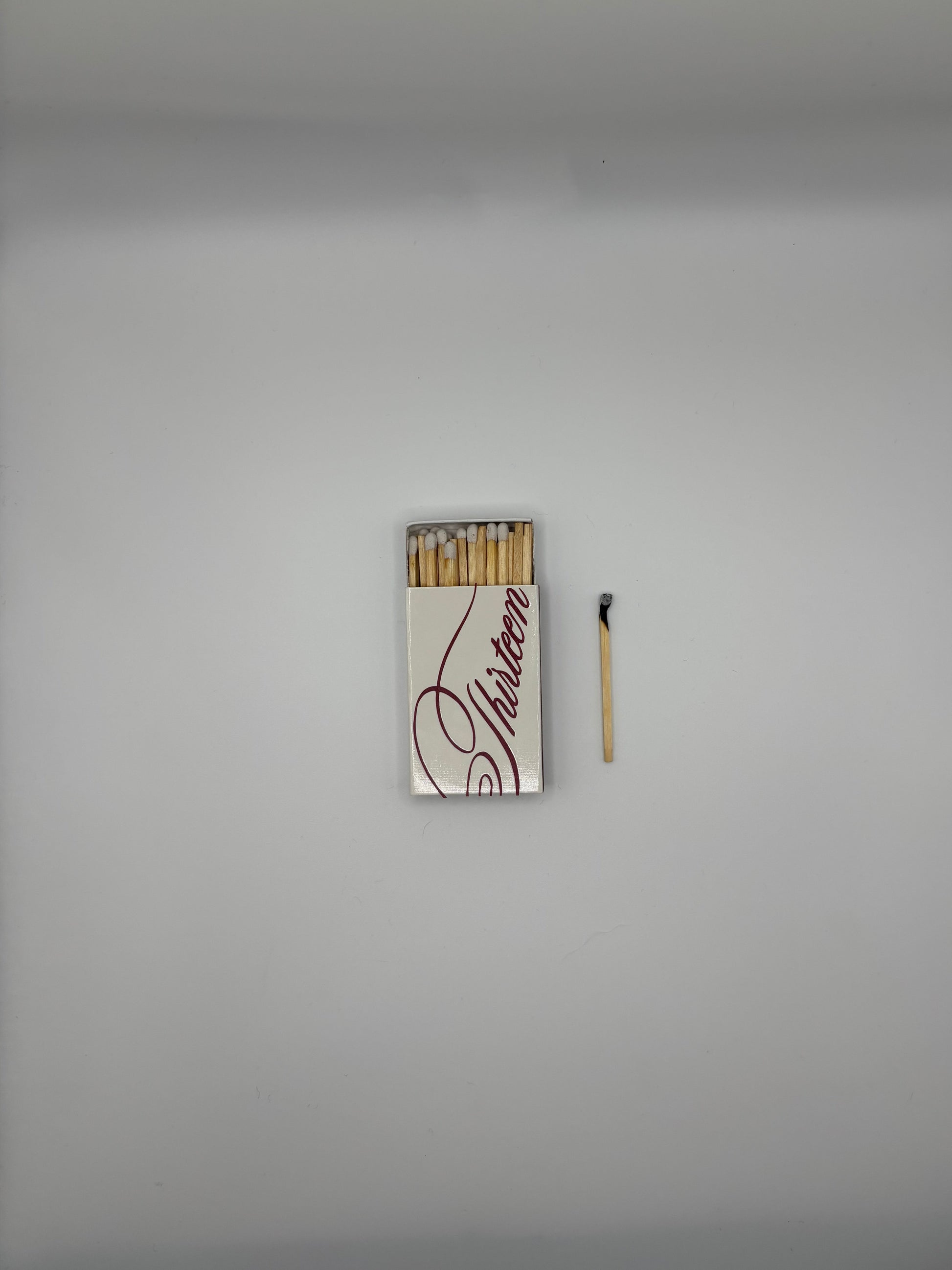 The Thirteen Thirteen Matches features a set of four custom matchboxes designed as functional objects and visual statements. The collection includes two distinct designs, one featuring a dramatic cursive font that spans the entire matchbox, and another centered around the classic logo. Each box is made to complement any space. One purchase includes a full set of four matchboxes, designed to be used, displayed, and collected.