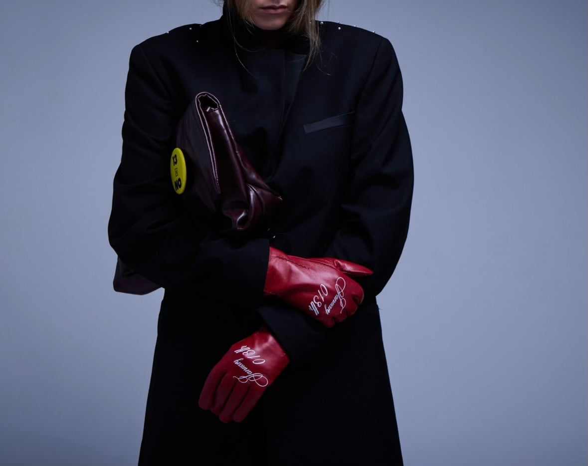 January 013th Red Leather Gloves crafted from 100% leather, designed to elevate any winter outfit. Detailed with cursive 'January 013th' across the tops of the hands, a signature date tied to Thirteen Thirteen. Striking in color and timeless in intent.